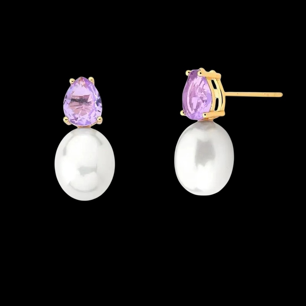 Belíssimo par de brincos com pérola Shell oval e cristal em formato de gota na cor ametista. Banho de ouro 18k.