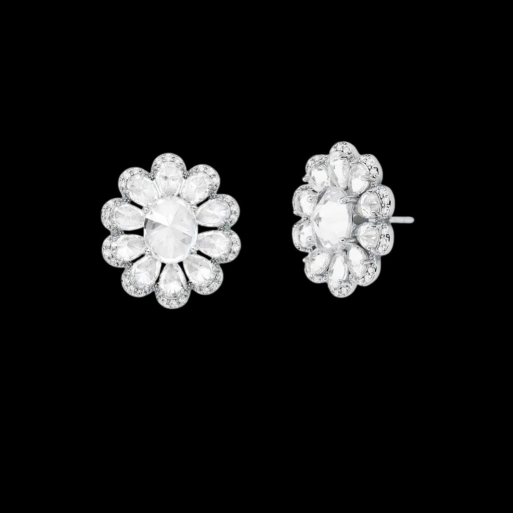 Brinco de flor com cristal de rocha e zircônias cravejadas. Banho de ródio.