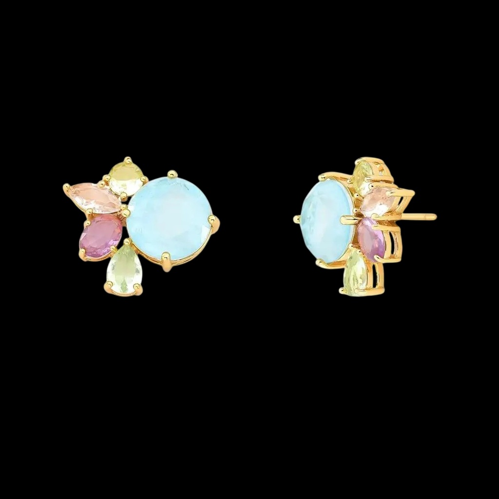 Ele possui pedra fusion turmalina azul e cristais coloridos. Banho de ouro 18k.