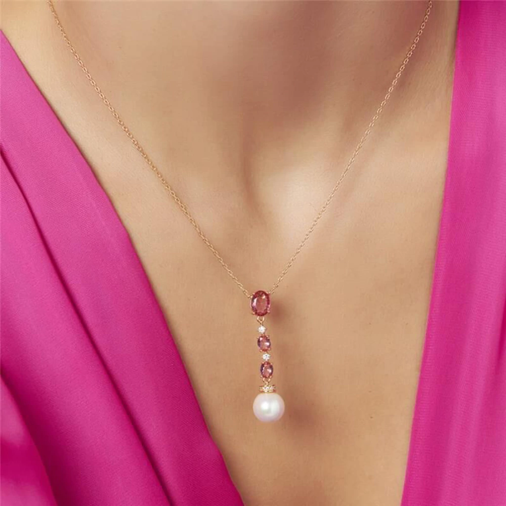Colar com cristais ovais na cor rosa, zircônias cravejadas, pérola Shell e banho de ouro 18k.