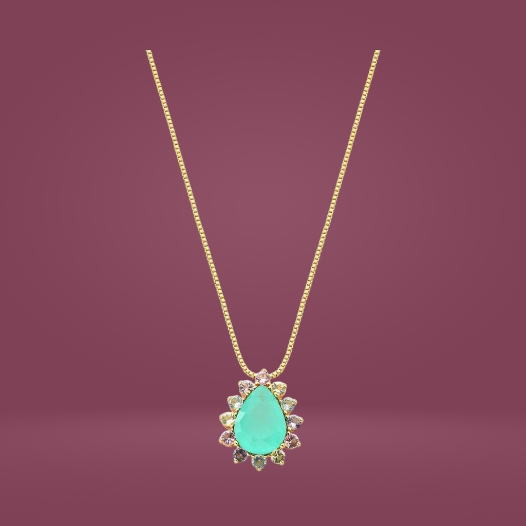Colar com pingente pedra fusion turmalina paraíba em formato de gota, com zircônias coloridas contornando toda a pedra. Banho de ouro 18k.